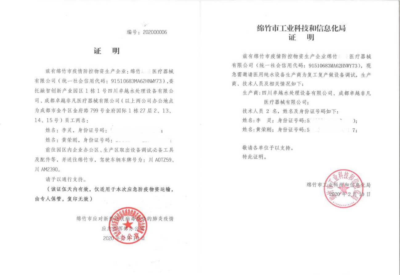 疫情就是命令,防控就是責(zé)任。卓越公司應(yīng)邀前往四川省綿竹市,為綿竹市疫情防控物資生產(chǎn)企業(yè)調(diào)試必備工具和配件等。在收到相關(guān)證明手續(xù)后,公司安排兩位經(jīng)驗(yàn)豐富的員工于2020年2月10日前往綿竹市。在抗?fàn)幰咔榈年P(guān)鍵時刻,肩負(fù)社會責(zé)任,爭做逆行者。